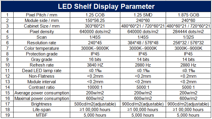 | Shelf LED Display Specifications | ||